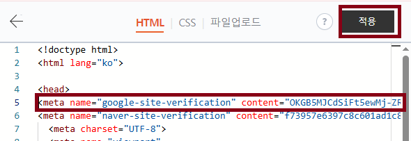 - <head> 밑에 위와 같이 복사한 태그를 삽입하고, 우측 상단의 적용을 클릭합니다.